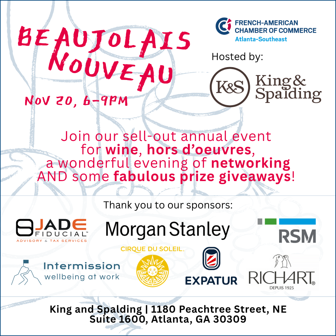 This celebration remains the largest event in the Southeastern United States dedicated to the tasting of the new harvest of the Beaujolais Nouveau. It is the perfect opportunity to toast to the strength of the transatlantic connection between France and the Southeastern US.