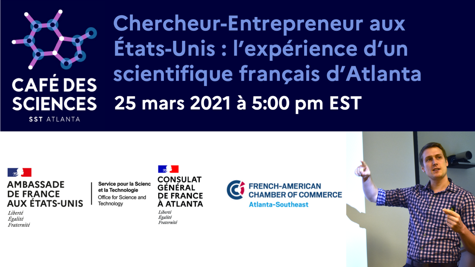 Le Service pour la Science et la Technologie de l'Ambassade de France, en collaboration avec le Consulat Général de France à Atlanta et la French-American Chamber of Commerce - Atlanta, vous propose de participer au premier Café des Sciences 2021 à Atlanta.