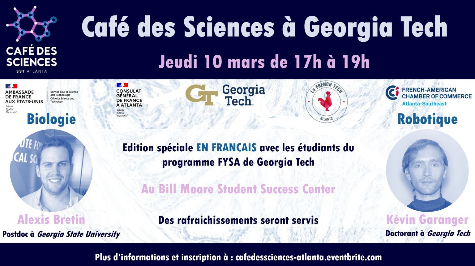Le Service pour la Science et la Technologie du Consulat Général de France à Atlanta, en partenariat avec la Chambre de Commerce Franco-Américaine d’Atlanta, la French Tech Atlanta et les étudiants du programme FYSA de Georgia Tech, vous propose de participer au Café des Sciences à Georgia Tech. Venez découvrir, le travail de deux jeunes chercheurs français à Atlanta. Les présentations seront en français et des rafraîchissements seront servis.
