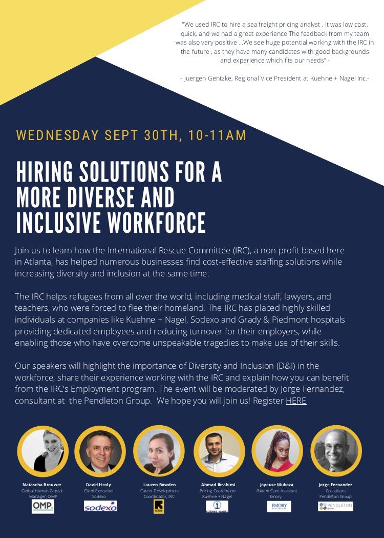 Our speakers will highlight the importance of Diversity and Inclusion (D&I) in the workforce, share their experience working with the IRC and explain how you can benefit from the IRC's Employment program.The event will be moderated by Jorge Fernandez, consultant at the Pendleton Group.