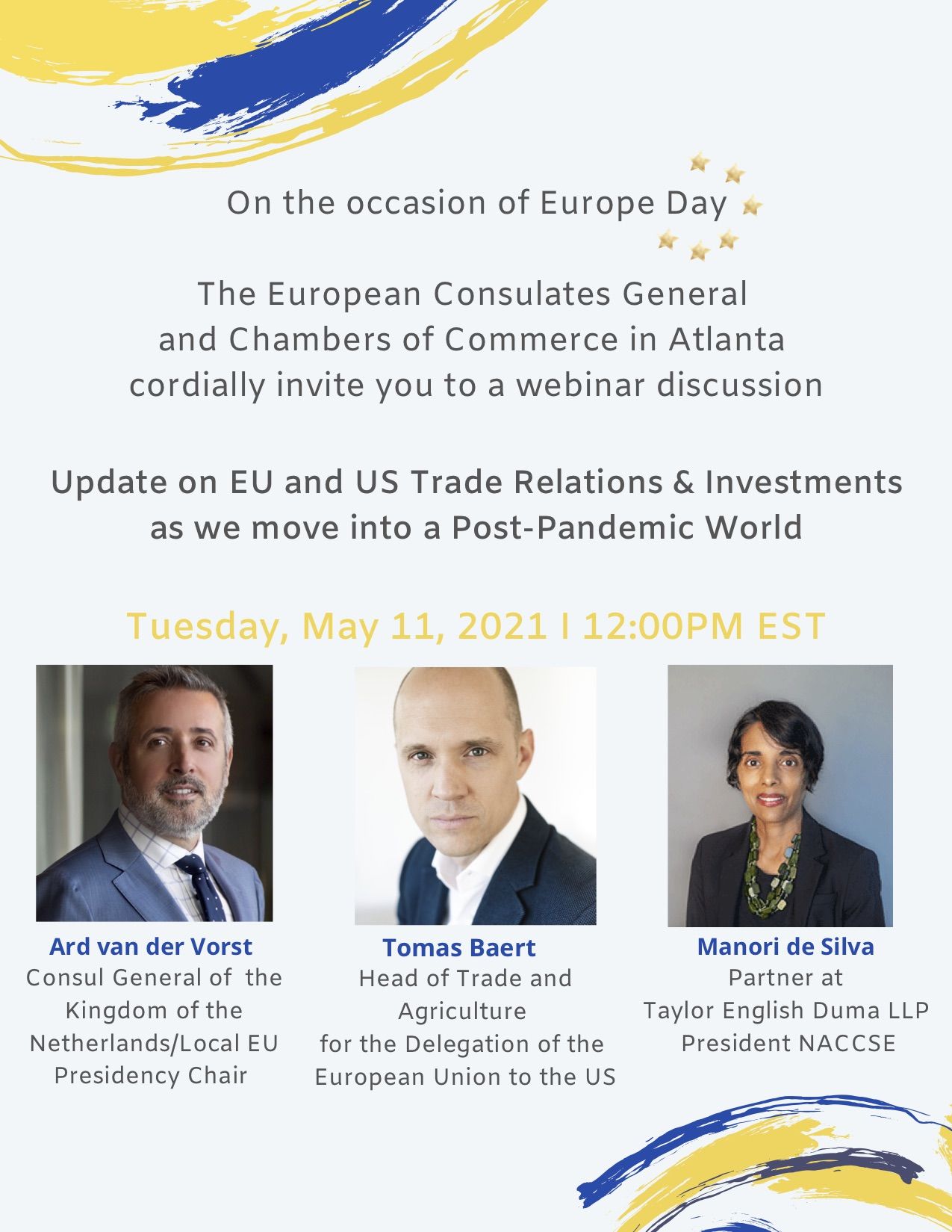 On the occasion of the Europe Day, we invite you to join us on Tuesday, May 11th at 12pm for the Europe Day webinar organized by the EU Consulates General and the Bilateral Chambers of Commerce in Atlanta.
