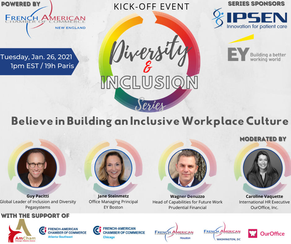 Join us on Tuesday, January 26, 2021 @ 1pm EST/19H Paris Time for the first event of this series, “Believe in Building an Inclusive Workplace Culture.” The panel discussion will be followed by Q&A with guest speakers. This is a great opportunity for professionals of all sectors from all company sizes to discuss and share their perspectives on how we each address unconscious bias.