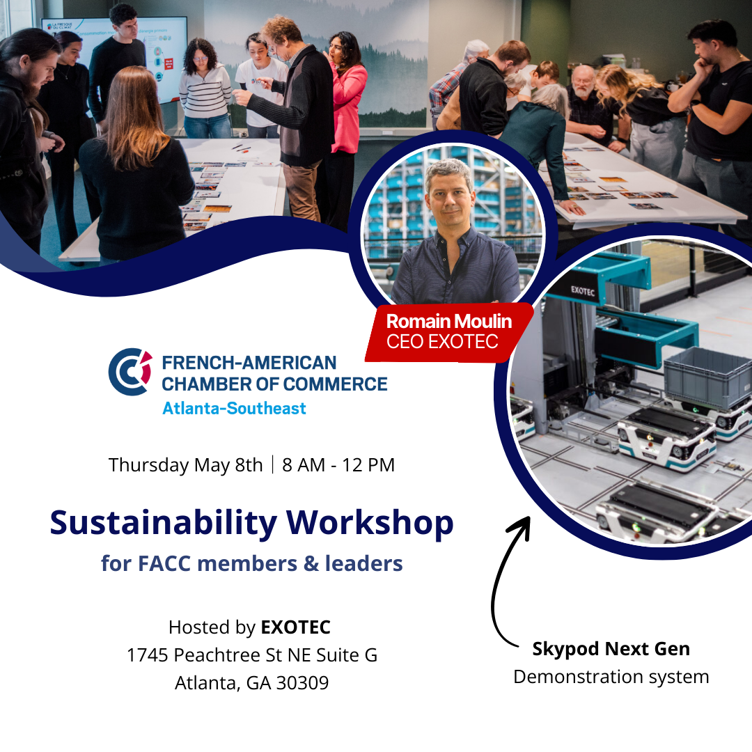 Exotec are always looking to reduce their carbon footprint and educate their employees about sustainability. At the moment 75% of their employees have participated in the workshop. Their goal is to reach 100%! This is why Romain Moulin, CEO of Exotec, has kindly offered to host and sponsor this sustainability workshop, in partnership with the French American Chamber of Commerce of Atlanta and the Southeast.