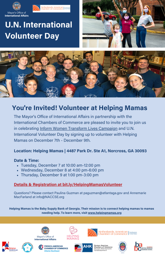 As part of the Inform Women Transform Lives Campaign, the Mayor’s Office of International Affairs in partnership with the International Chambers of Commerce is pleased to invite you to join us in celebrating U.N. International Volunteer Day by signing up to volunteer with Helping Mamas on December 7th - December 9th.