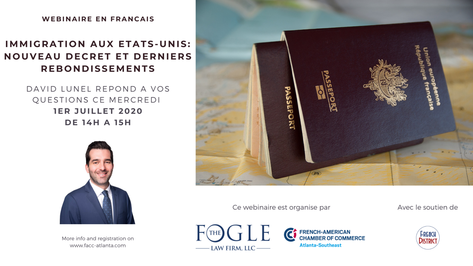 Le nouveau décret présidentiel concernant la suspension de certains visas inquiète légitimement la communauté francophone installée aux Etats-Unis. La dernière proclamation de Donald Trump impose effectivement de nouvelles restrictions à tous les détenteurs de visas H-1B, H-2Bs, L-1, ainsi que les travailleurs à court terme sous visa J-1. Parce que vous avez été nombreux à nous contacter ces derniers jours concernant ces récentes restrictions, nous proposons une conférence virtuelle gratuite pour répondre à toutes vos questions. Après un court panorama général de l’actualité en immigration, Maitre David Lunel abordera la dernière proclamation présidentielle et ses conséquences, la situation des étudiants étrangers aux Etats-Unis, l’adjudication des cartes vertes à l’heure du COVID ainsi que la situation des entrepreneurs et des travailleurs détachés. Merci de nous faire parvenir vos questions pour la deuxieme partie Questions-Réponses de la conférence virtuelle.