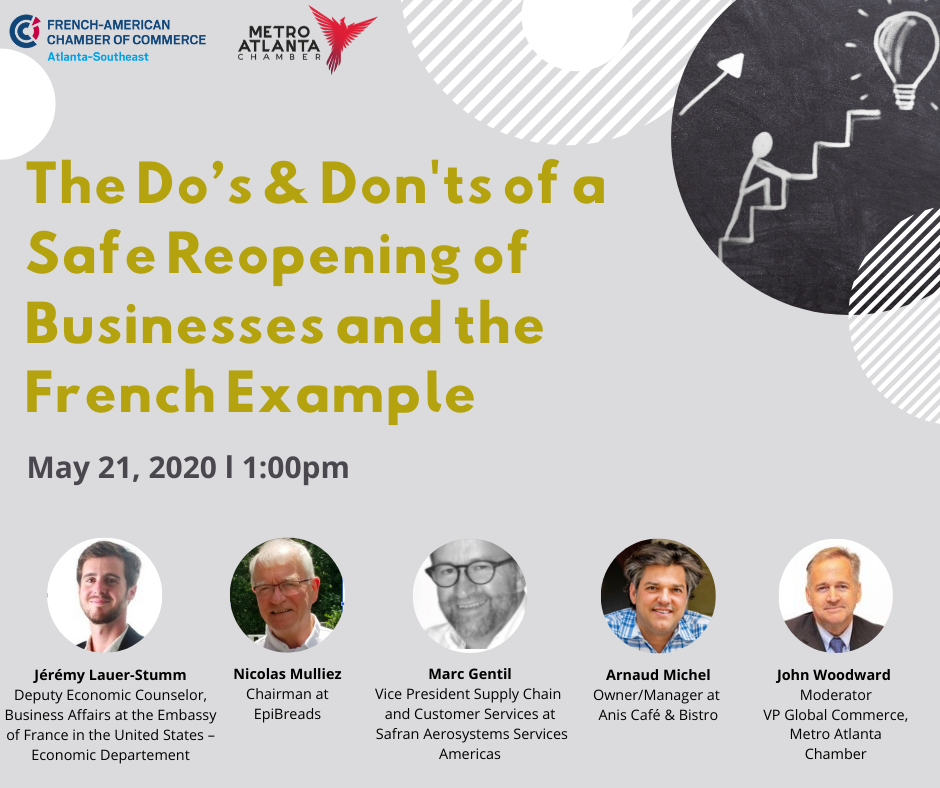 The French-American Chamber of Commerce - Atlanta, in partnership with the Metro Atlanta Chamber of Commerce, is pleased to invite you to a Roundtable Discussion on how to safely reopen your business with: