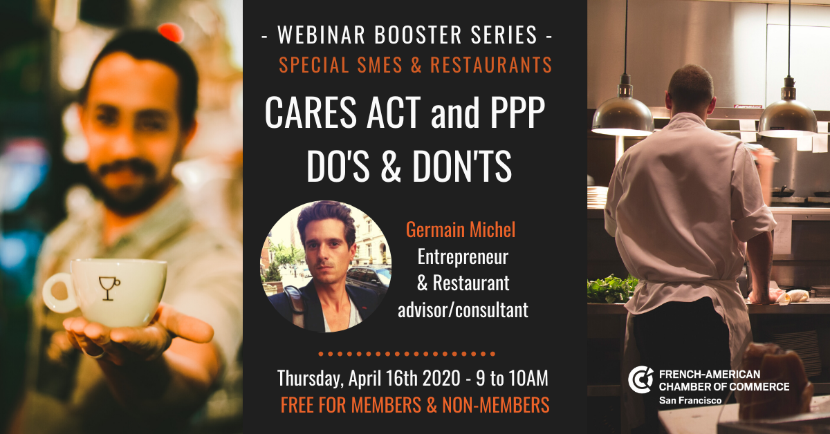 Join us on Thursday, April 16th for our Webinar Booster Series - Special SMES & Restaurants! Germain Michel, founder and co-owner of Amelie Wine Bar & Bistro, will share his expertise about CARES ACT and PPP.