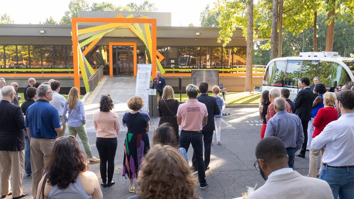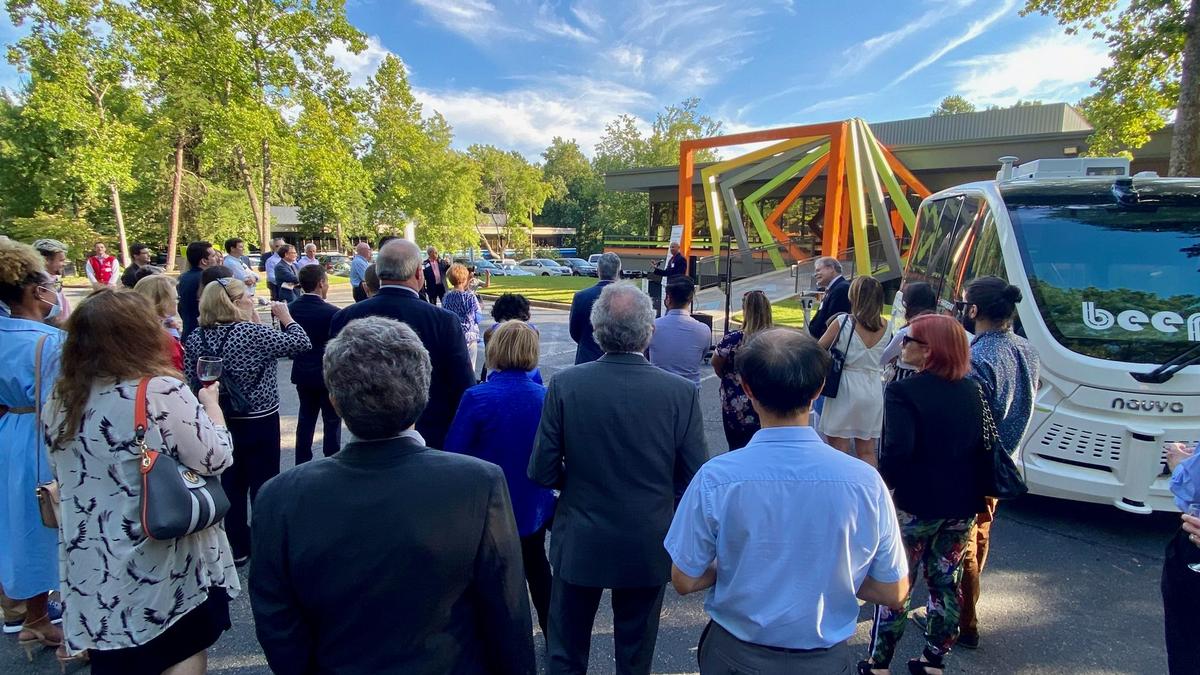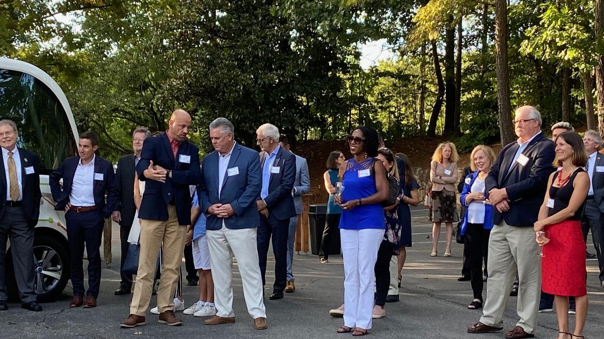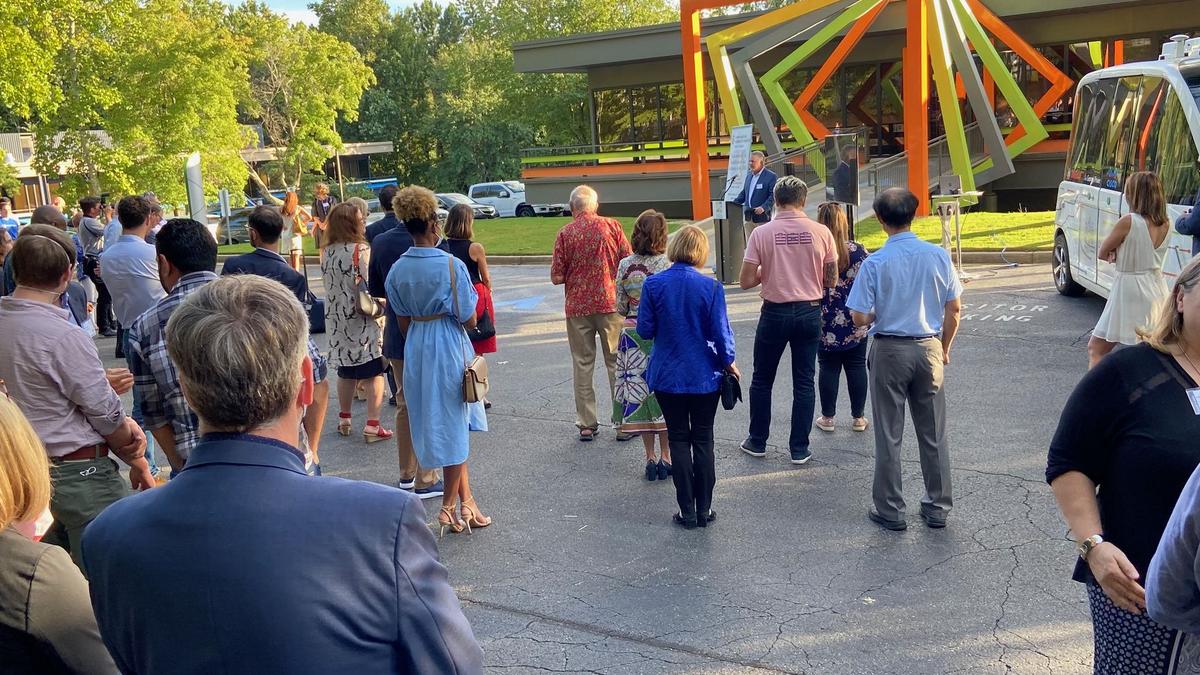 Our guests also enjoyed some live demonstrations featuring an AV Shuttle being there for attendees to get on and see, a Drone Test (The company, a Startup out of GA Tech, uses real time data to map our flight paths for drones and can adjust path in real time based on changes in the environment and a robot who delivered the ribbon and scissors.